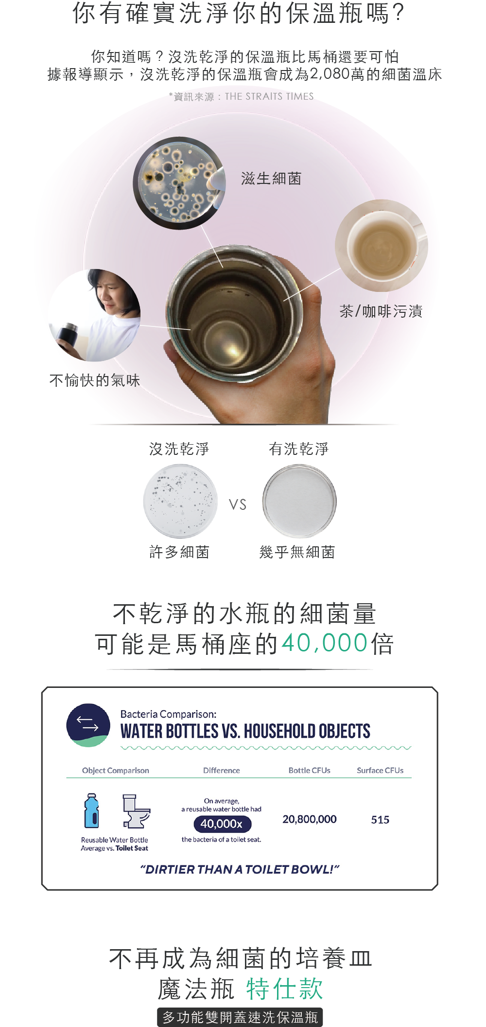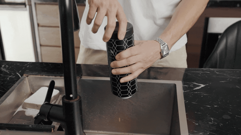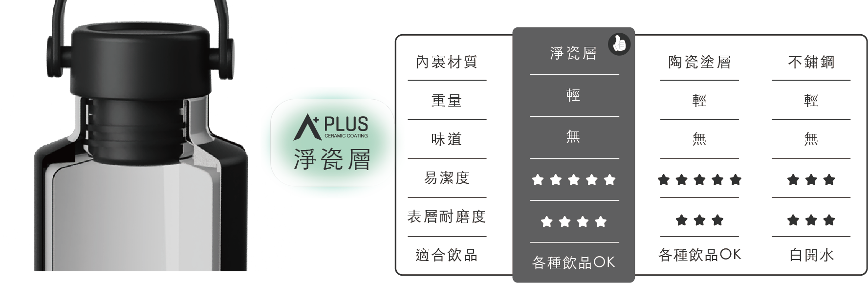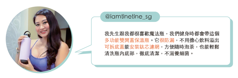 獨特雙開蓋結構,讓最難洗到的瓶內底部也能輕鬆洗淨,不養細菌、不易藏汙納垢,喝得更安心。淨瓷塗層內裏搭配堅固的304不鏽鋼瓶身,耐用、易潔又輕盈,味道污漬不易殘留。