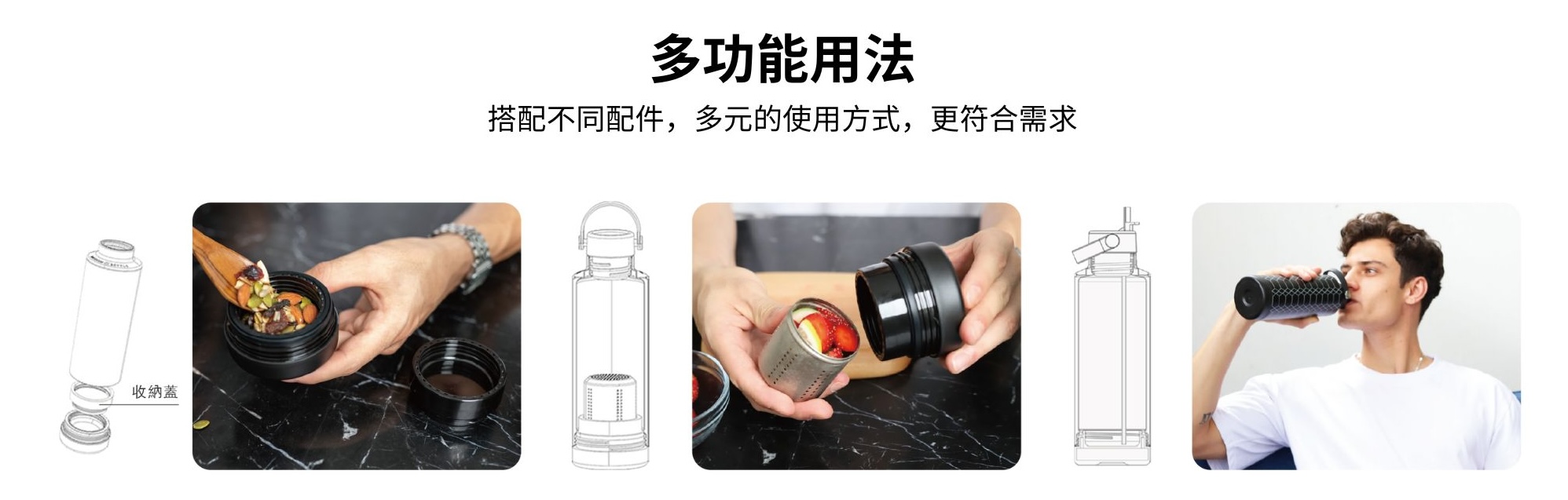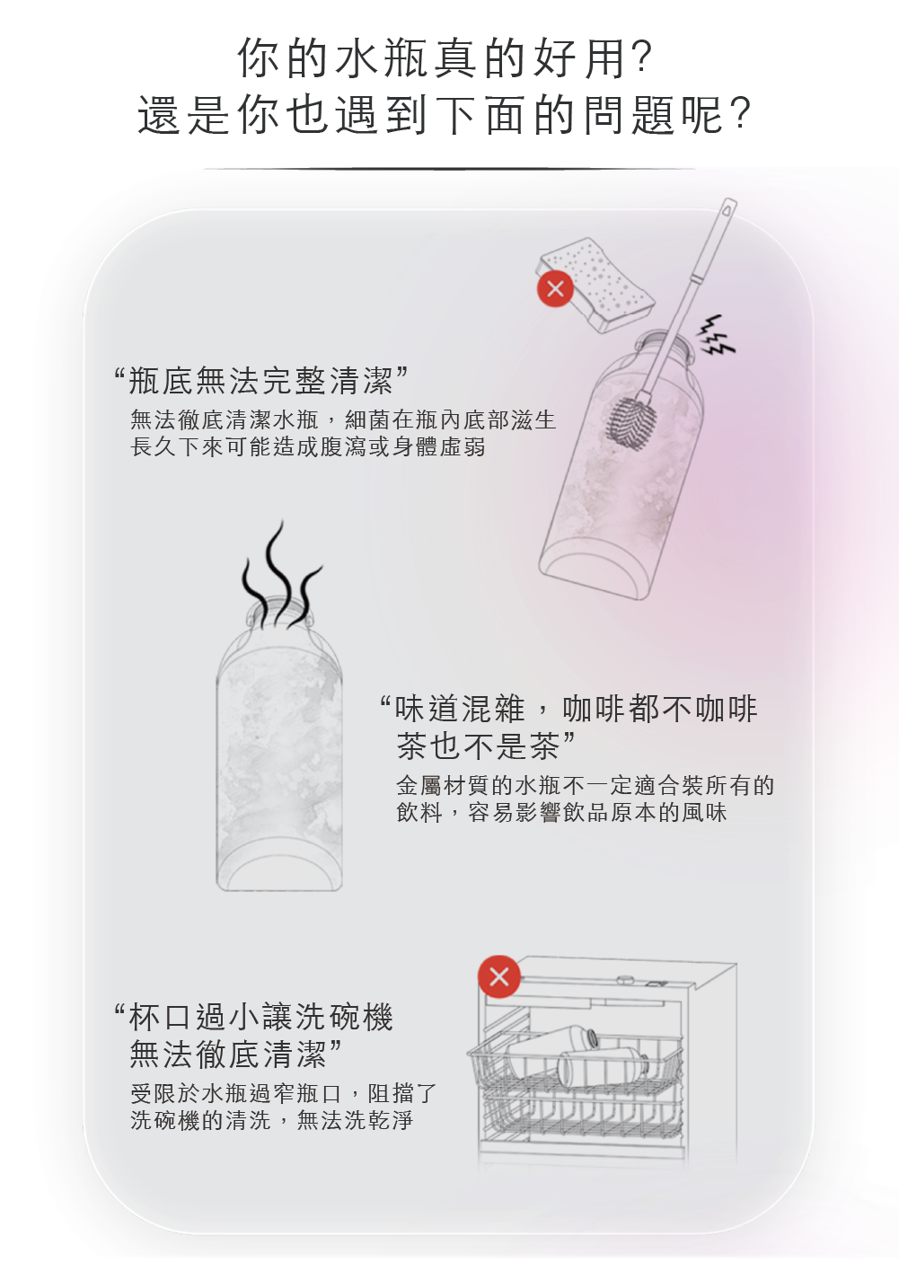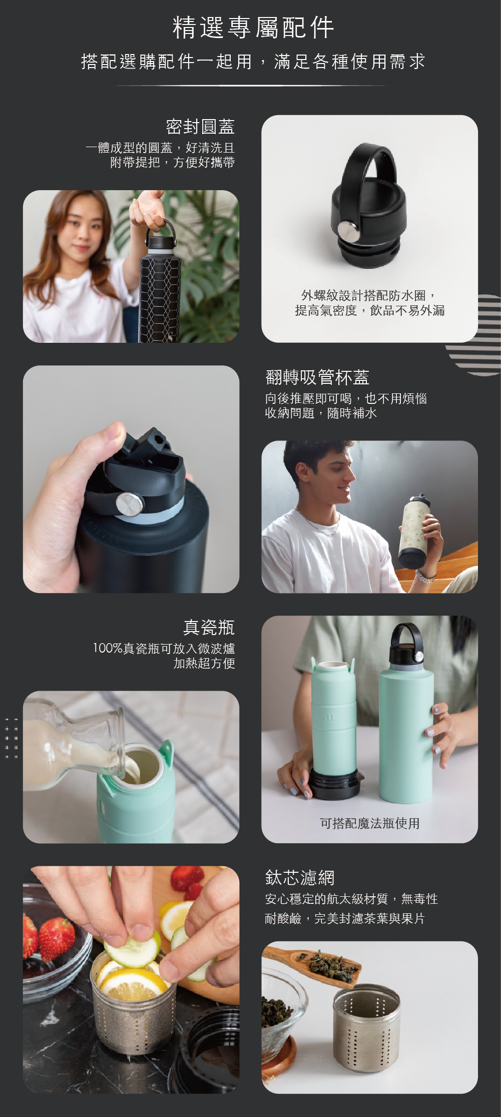 獨特雙開蓋結構,讓最難洗到的瓶內底部也能輕鬆洗淨,不養細菌、不易藏汙納垢,喝得更安心。淨瓷塗層內裏搭配堅固的304不鏽鋼瓶身,耐用、易潔又輕盈,味道污漬不易殘留。