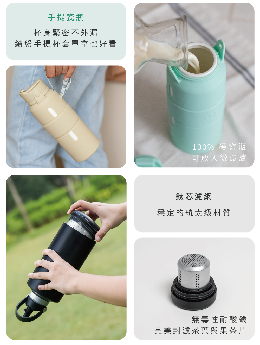 不論是手提瓷瓶100%硬瓷內芯或是模擬硬瓷特色,多了一層釉保護的淨瓷層,兩者的表面毛孔細小光滑,適合盛裝各種飲品,味道也不會殘留在瓶中。