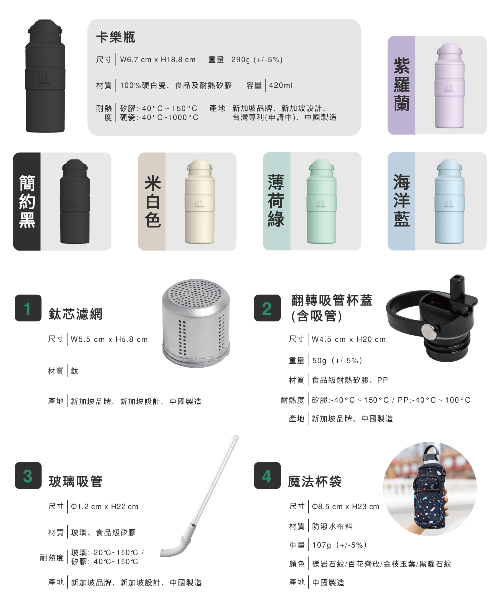 卡樂瓶是一款具有矽膠外套和蓋子的瓷瓶,雖然輕巧但仍可放入微波爐加熱。所有零件可拆卸,方便清潔。