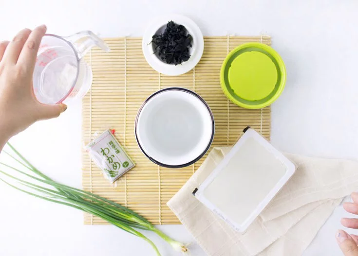 50克 嫩豆腐2克 日本昆布少許 蔥花20克 味噌醬350ml 熱水