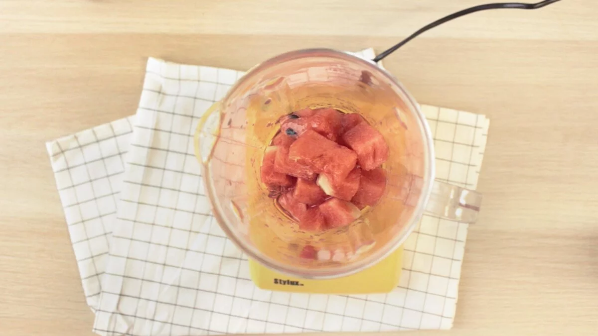 2. 在攪拌機中,混合西瓜塊,糖漿和鳳梨汁,將他們均勻混合。