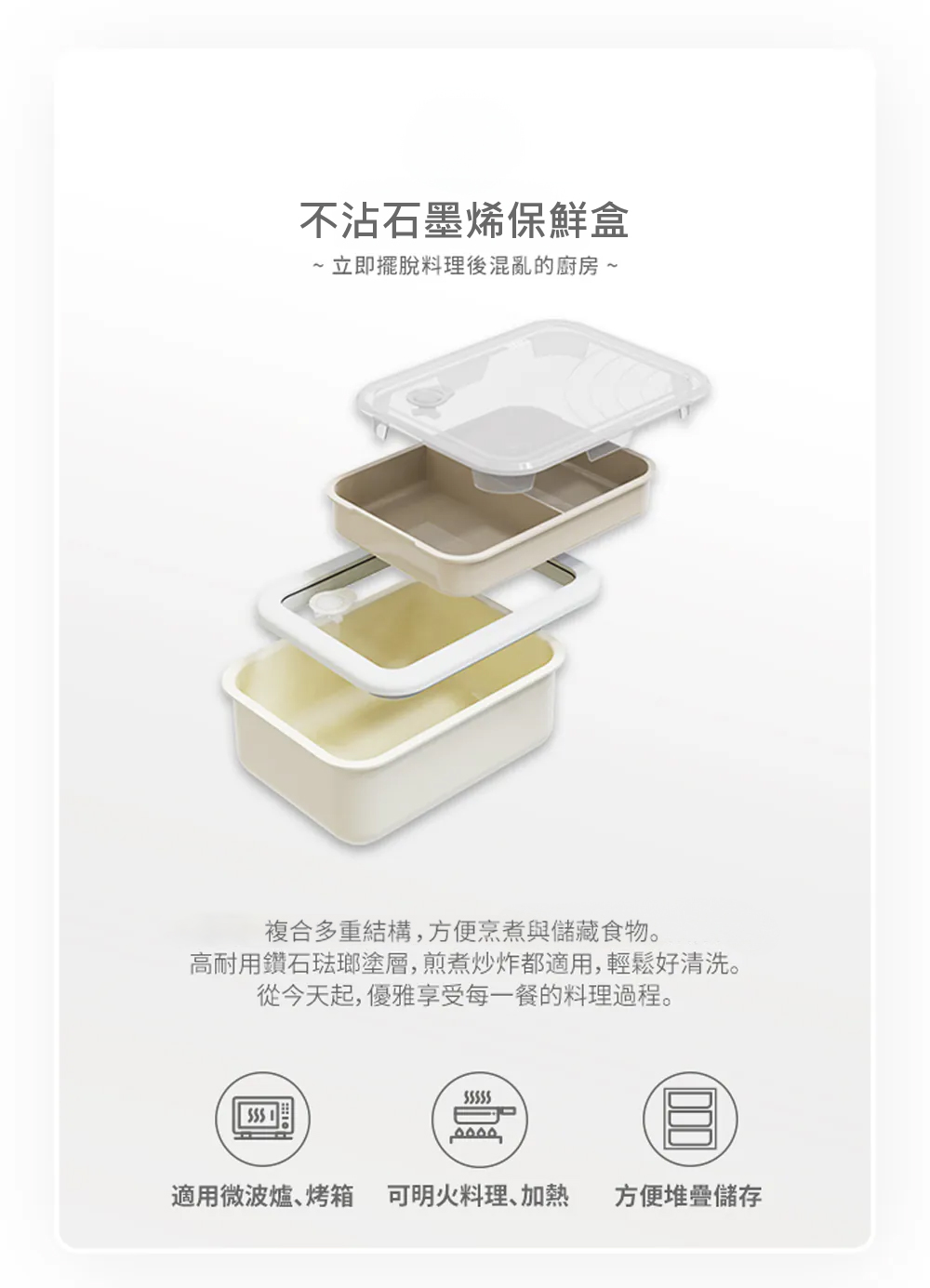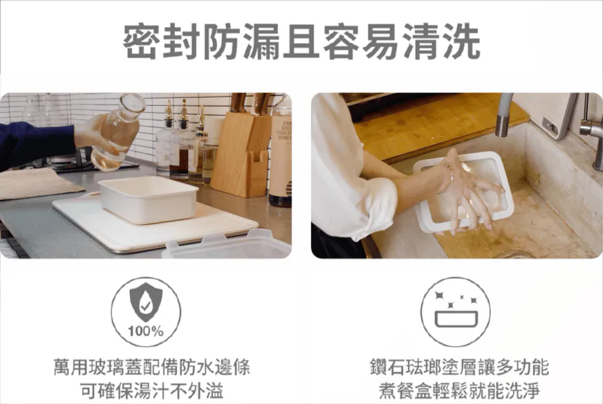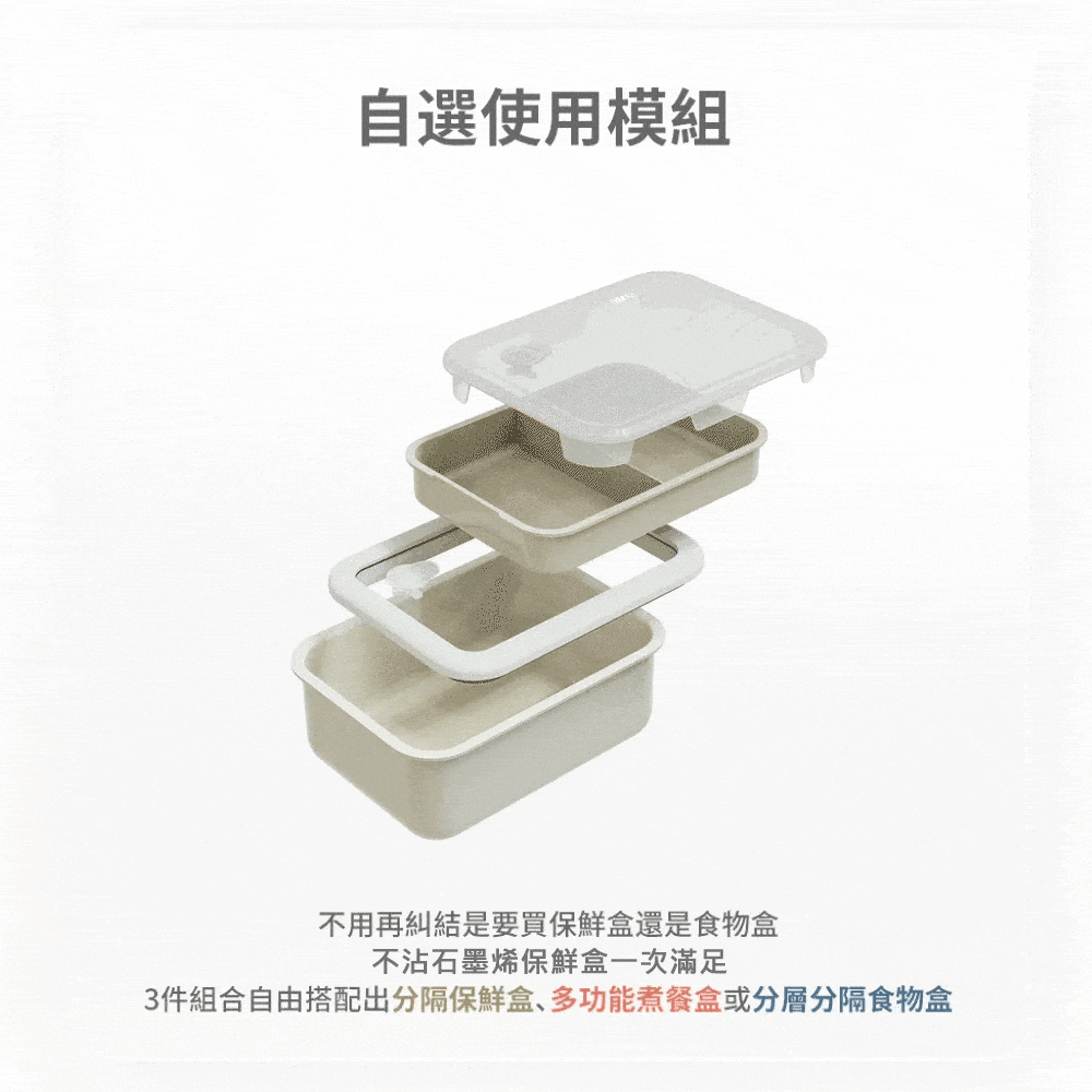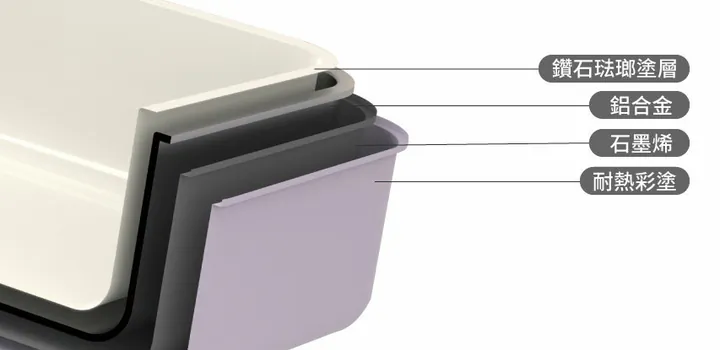 複合多重結構讓多功能煮餐盒使用更多樣化,最內層採用堅固又耐用的鑽石琺瑯塗層,不沾且耐高溫,容易清洗;鋁合金與石墨烯材質結合讓盒身加熱速度較一般不鏽鋼材質快30%;最外層的耐熱彩塗則讓多功能煮餐盒擺脫一般金屬盒冷冰冰的樣貌,更繽紛多彩。