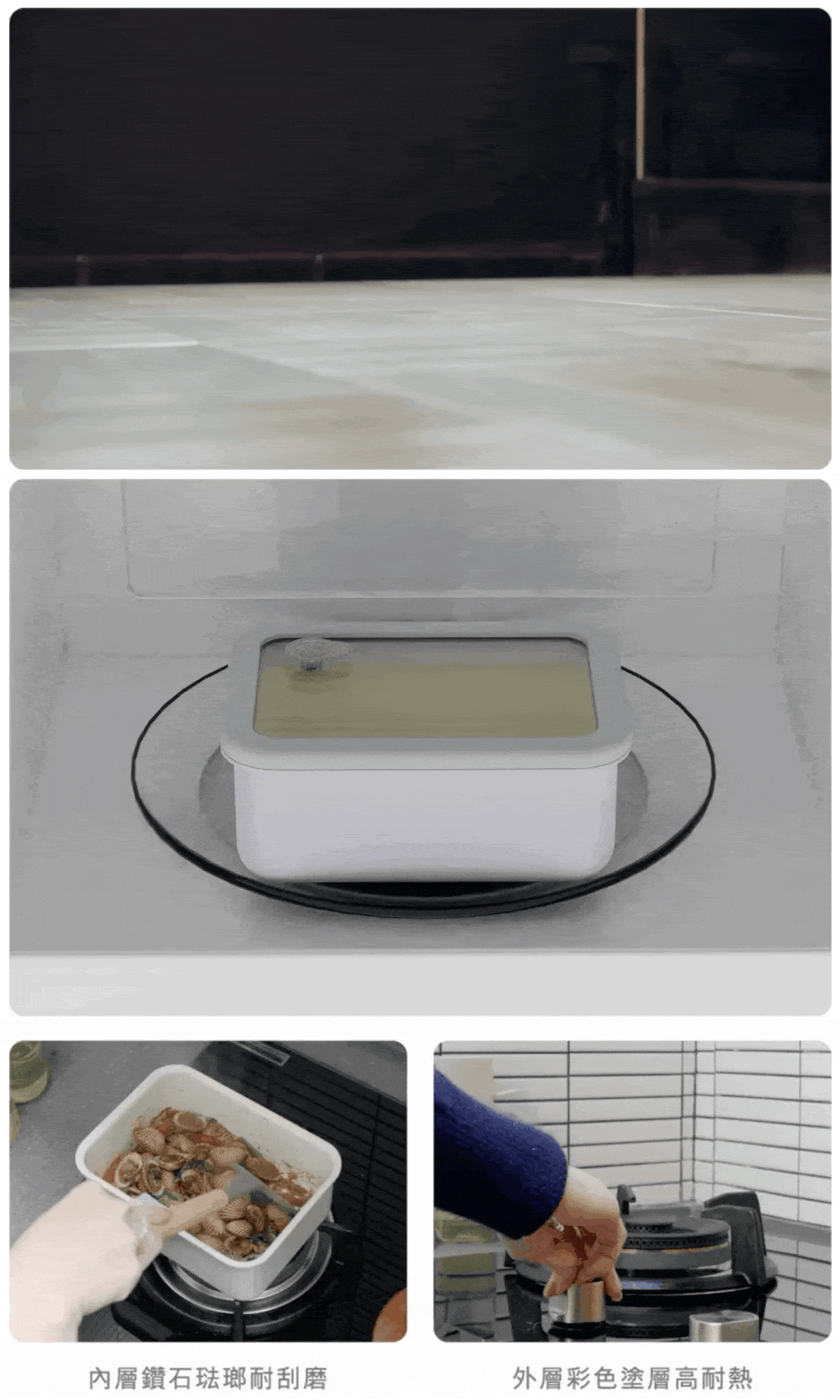 內層採用新開發的鑽石琺瑯塗層,是一種高耐用度琺瑯,安全、堅固又抗刮磨,可抗酸抗腐蝕,可耐最高350度高溫,煎煮炒炸都沒問題。