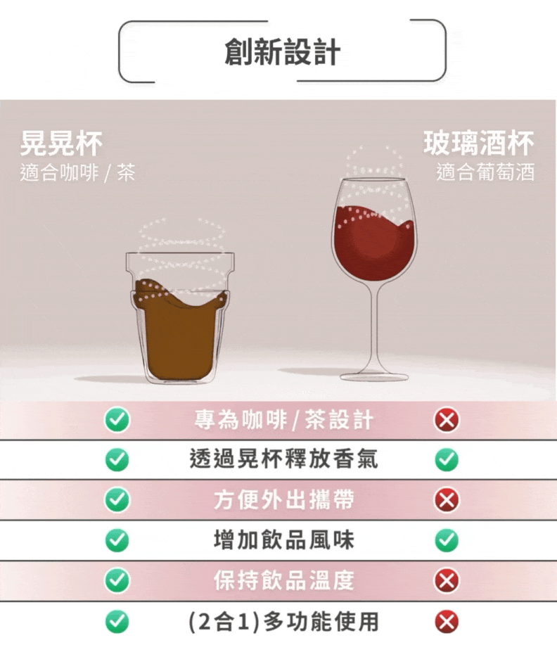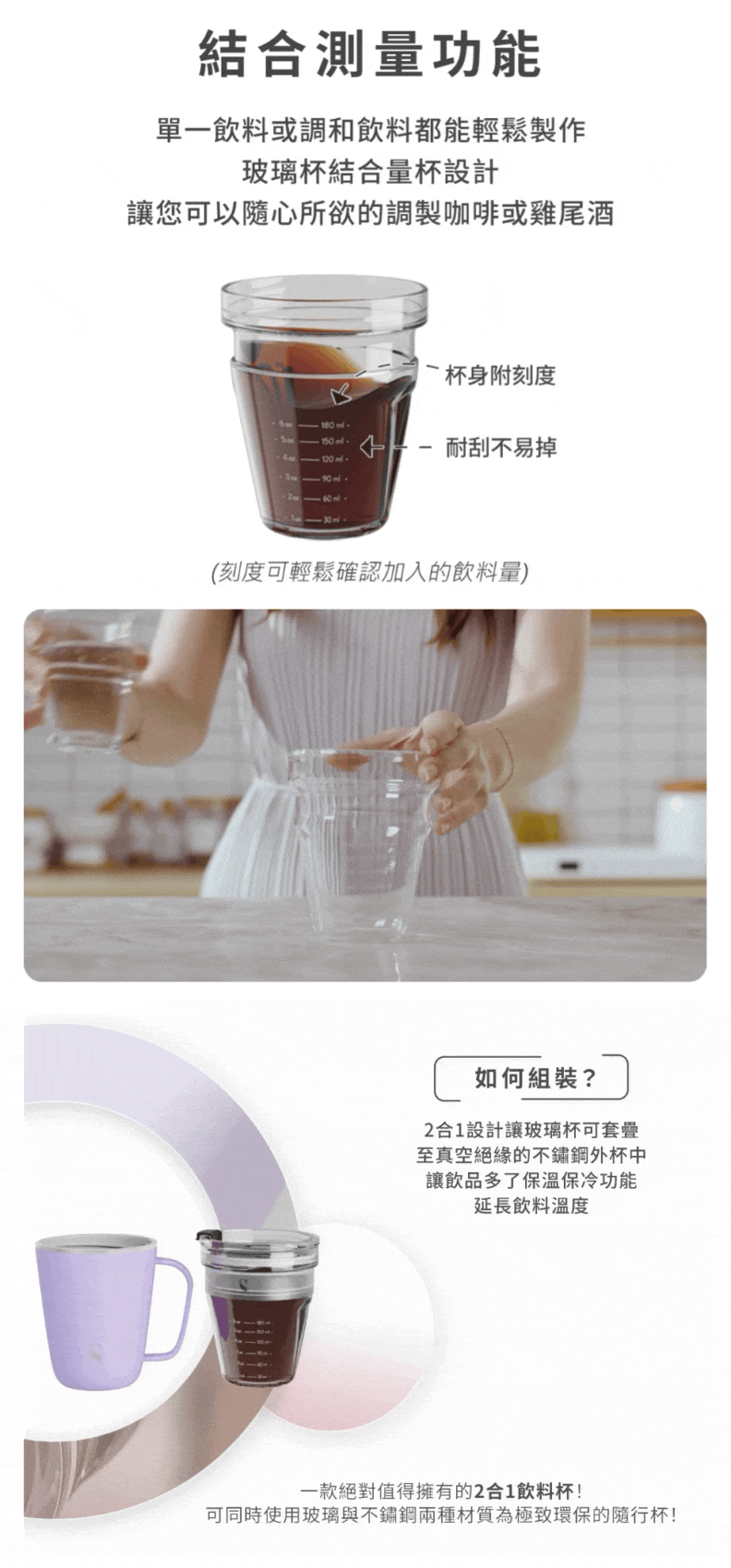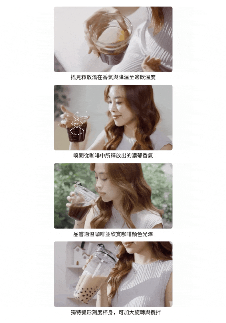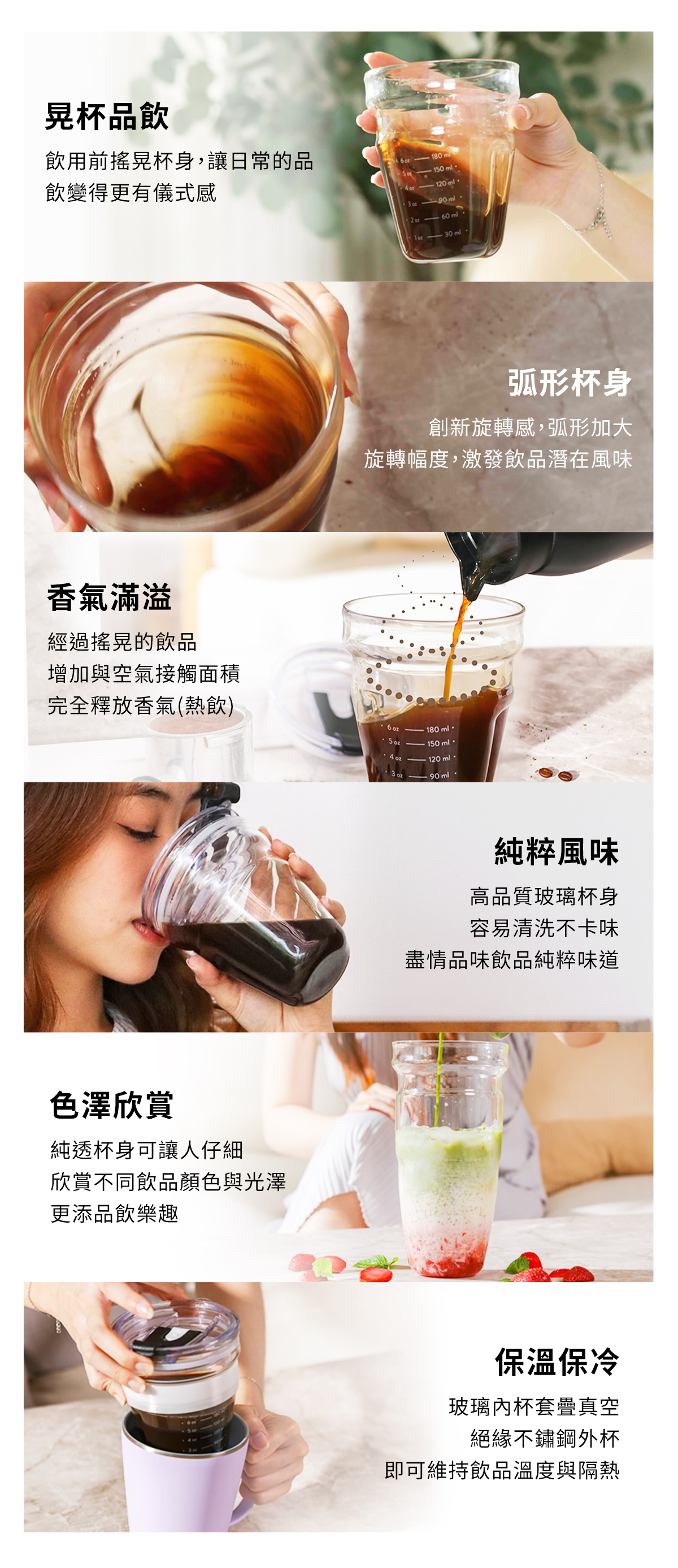 體驗創新與優雅的完美結合 — 晃晃馬克杯。 其弧形玻璃設計透過輕柔的晃動動作,提升香氣與風味,讓咖啡與茶更香醇細緻。 如需更長效的保溫效果,只需將玻璃杯置入真空不鏽鋼保溫底座中即可。